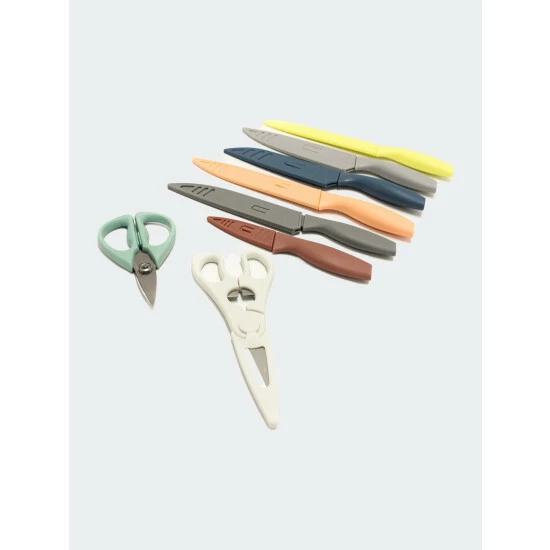 Add some color to your kitchen with this knife set, with 6 knives and 2 pairs of scissors you can chop, dice, and slice to your hearts contnet! All the knives and one pair of scissors include matching sheath to keep your knives sharp and to kee you safe.