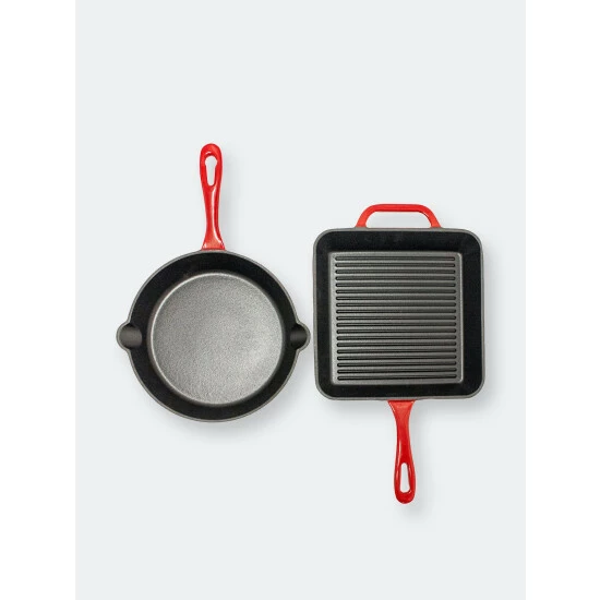 This 2-piece cast iron set is a kitchen staple every ambitious chef should have. Both pans are 10″ and have a classic, modern design: one is round, and the other is square-shaped with grill marks. These pans are compatible for gas and electric stoves. Plus, they’re oven-safe up to 400 degrees Fahrenheit. We love that these pans are enameled, non-stick, and non-toxic. Each pan has hanging loops for easy storage, and they’re also stackable to save space in your cupboards.
