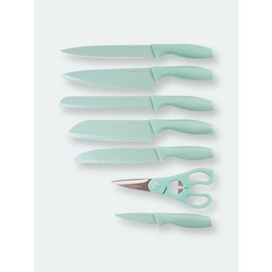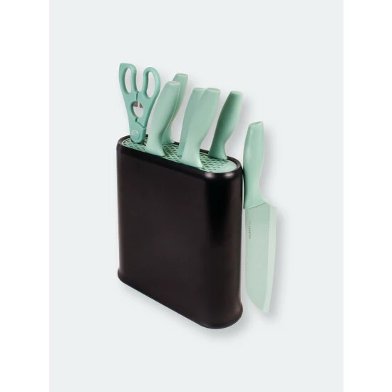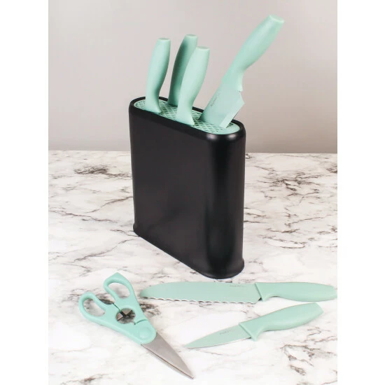 With a perfect combo of modern design and practical features, this 8-piece mint knives and black pp block with two-tone knife insert set is an asset in any kitchen. The award-winning knife block is equipped with a non-skid base for a secure placement and comes with a two-tone knife insert. This knife set has non-stick coating blade and soft-grip handle so you’ll be cutting, slicing and dicing your way around the kitchen in no time! The removable insert is easy to clean and provides storage space for up to 8 knives while the block’s non-skid base ensures a good grip on the countertop. Spend no time on clean-up with the removable knife block. Dishwasher safe, hand-wash recommended for long lasting use. With this essentials steak knife set, treat yourself and your guests to the ease of cutting through steak like butter.