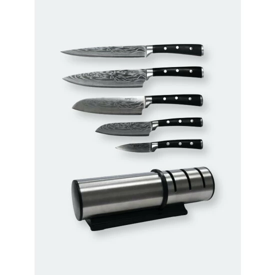This 5 piece knife set by BergHOFF was designed for bold beauty as much as it was peak performance. A distinctive pattern on precisely honed blades is perfectly balanced by a smooth, triple-riveted handle for extra strength that fits comfortably in your hand. Always use a high quality steel by BergHOFF for your top quality knives. These sharpening devices are exactly made to match the steel of the blades and guarantee an optimum result. Be sure to maintain a 20° angle from tip to handle over the complete length of the blade. The speed of the process has no impact on the result. (8.25″ Carving, 8″ Chef, 7″ Santoku, 5″ Santoku, 3.25″ Paring)