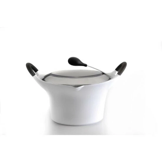 The 10″ covered stockpot holds 5.6 qts. The auriga cookware reflects a certain finesse and delicacy. Even though the cookware is made of cast aluminum it looks elegant and light. Designed by belgian designer ilse raymaekers. The cast aluminum body provides fast and equal heat distribution. Straining holes in the rim of the cover to drain liquids. Practical pouring spout. The handles stay cool. 3 layer ceramic non-stick coating (pfoa & ptfe free).