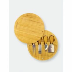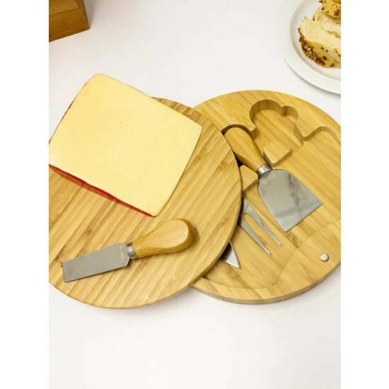 Great addition to any home, this circular bamboo plate has a multi-functional space efficient design. To open, the top swivels out revealing hidden compartment that holds four different cheese knives with stainless steel blades. Hold fruit or cheese on top for an eye catching centerpiece.