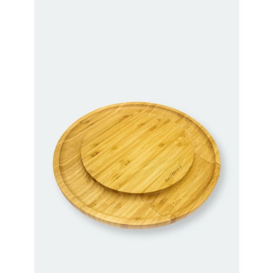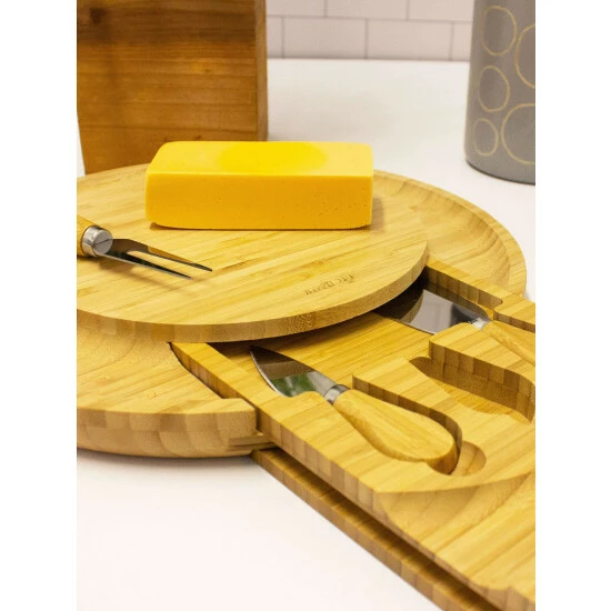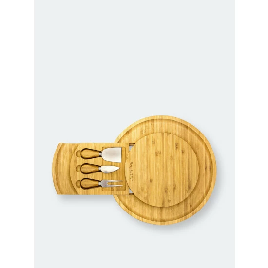 If you love to host, this set is made for you. Featuring a slide-out tray to hold the 3 included knives, this set helps you create the perfect meat and cheese platter. The beautiful bamboo adds variation so no two are alike. This beautiful bamboo wood entertainer has a generous serving area combined with a high-capacity curved cracker well around the entire board.