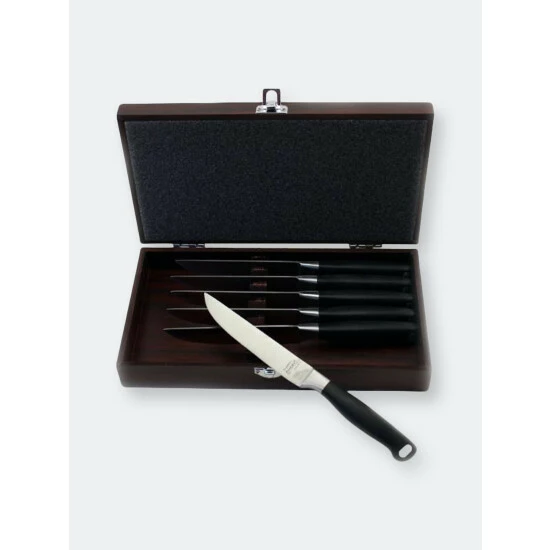 Set Includes: 6 (4.75″) steak knives, with a wooden case. Made from high quality Chrome-Molybdenum-Vanadium steel, the forged bolster is featured for added weight, perfect balance, and increased safety. The handles are state of the art nick-resistant, ergonomically molded poly-oxy-methylene, a material often used as a direct replacement for metals.