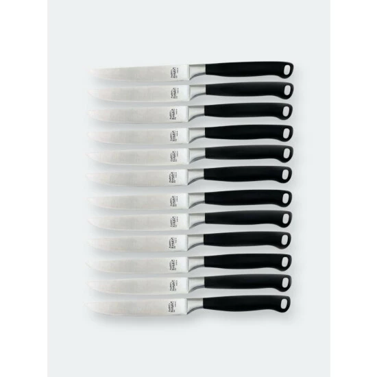 Set Includes: 12 Pieces Steak Knives. This knife set is made of durable high-quality stainless steel is absolutely indestructible and corrosion resistant. The highly polished surface is hard wearing, thick, easy to clean and hygienic. Advanced manufacturing methods plus traditional craftsmanship guarantee flawless product quality.