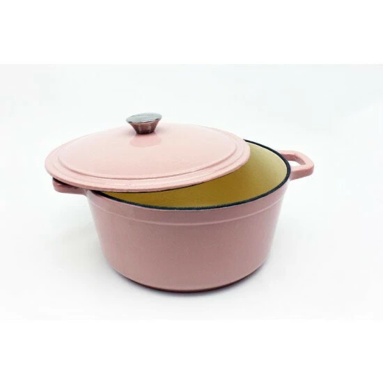 The 7qt Cast Iron pink stockpot dish is a modern collection that marries function, design and innovative use of materials to create an outstanding line of cast iron cookware. The cast iron is marked by pure lines giving each product its own identity and functionality. The covered dishes are ideal for slow cooking stews, braising, baking and so much more. It is enameled inside and out and suitable for all heat sources including, gas, electric, induction and ceramic.