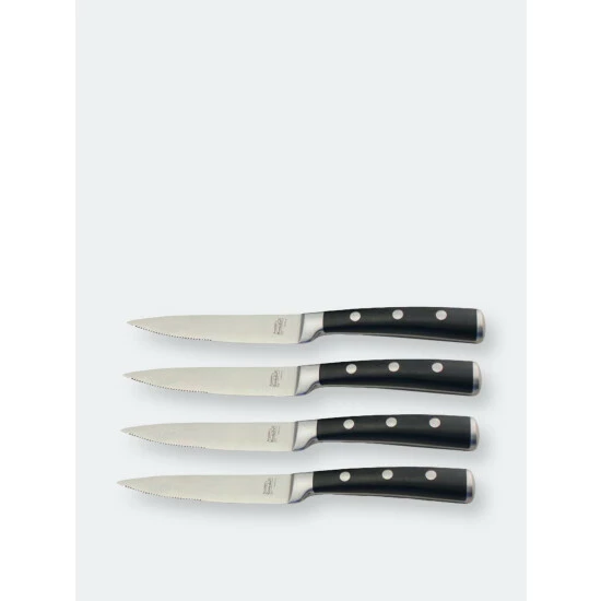 Set Includes: 4pc steak knives. Everyone needs a great knife set! Durable high-quality stainless steel is absolutely indestructible and corrosion resistant. The highly polished surface is hard wearing, thick, easy to clean and hygienic. Advanced manufacturing methods plus traditional craftsmanship guarantee flawless product quality. Made of stainless steel blades and ABS handles.