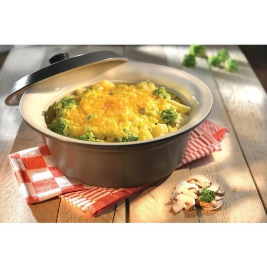 This Collect’n Cook line baking dish uses a glazed, chip-resistant stoneware material. Beautifully fits any type of table setting and style. The lip around the edge offers a comfortable grip, even when wearing oven mitts. The material gently conducts heat for even baking and cooking. Comes with a lid to help keep in the heat while cooking.