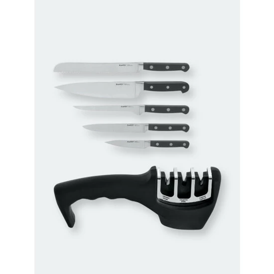 Chef’s of all experience know it’s essential to have quality professional knives. This professional set from BergHOFF’ Contempo cutlery comes with (8″ Bread, 8″ Chef, 6″ Boning, 5″ Utility, 3.5″ Paring) and is crafted from the highest quality stainless to resist stains and rust and is coupled with curved, triple riveted ergonomic handles for exceptional balance and precision cutting. Dull knives are a thing of the past! With this handy pull-through sharpener you can sharpen your kitchen knives in 3 simple stages. The diamond surface prepares the knife for sharpening, the tungsten steel restores the cutting edge into a V-shape and the ceramic stone polishes the blade and removes any irregularities. The sharpener’s comfort-grip handle with non-slip base ensures extra stability.