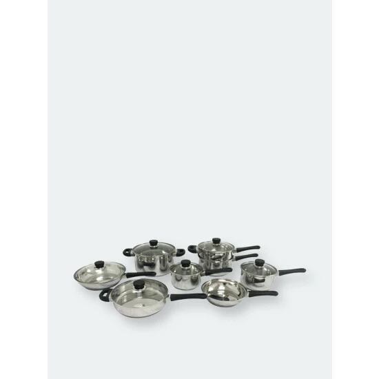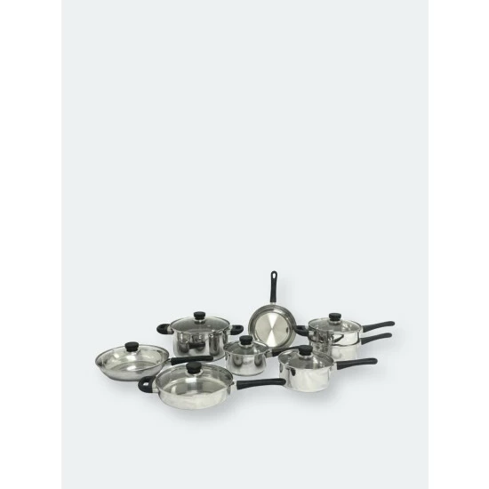 It’s made of durable, easy to clean stainless steel that also provides fast and even heat distribution. Handles stay cool while for safe handling. Glass lids.
