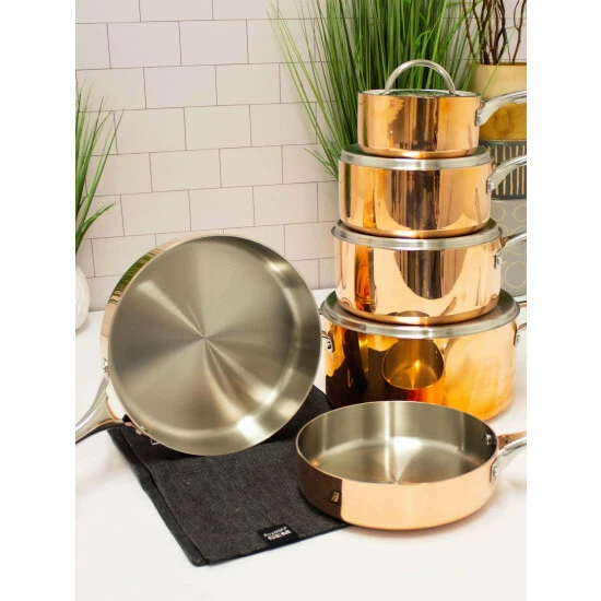 - Materials: Tri-Ply Copper + Aluminum Core + 18/10 Stainless Steel cooking surface