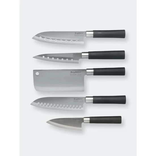 This set includes 5″ santoku knife, 7″ santoku knife w/holes, 7″ santoku knife, 4.5″ santoku knife and 6.75″ cleaver – A santoku knife is an Asian style knife with a straight edge. It’s an all-round knife for a variety of tasks. The wide blade allows for some typical activities like crushing garlic and scooping up the chopped ingredients on the blade. The holes in the blade reduce sticking of the cut items to the blade. The cleaver is designed to cut through meats and bones with the convenient hanging loop on the top of the blade. Be assured, this knife set is made of durable stainless steel and with proper care, will stand the test of time!