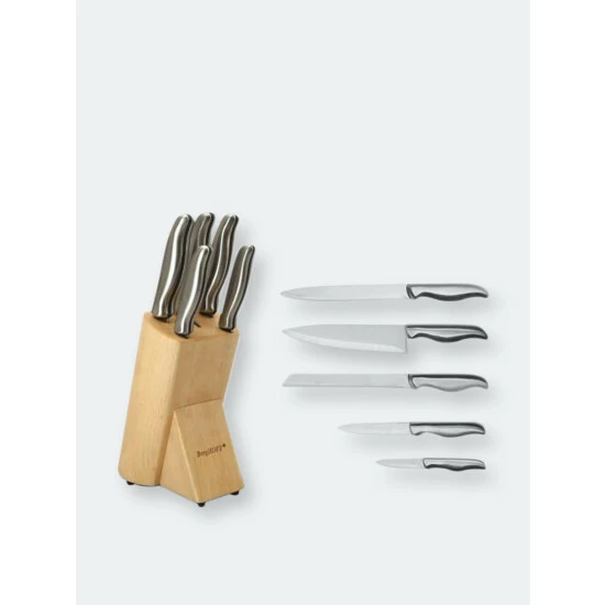 Want to jumpstart your knife collection? Then this 6 piece knife block is the way to go! This versatile set contains a hand-sharpened stainless steel paring knife, utility knife, carving knife, bread knife and chef’s knife. In the beautiful wooden knife block you can conveniently keep all these knives organized and within reach for efficient food preparation.