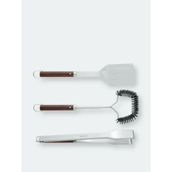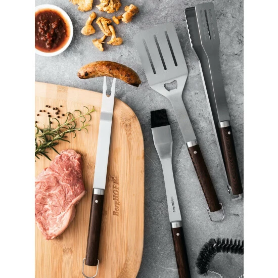 A convenient pair of tongs to get a good grip on a wide variety of foods, a practical spatula to flip a burger, a steak or a larger piece of meat on the grill and a durable wire brush to clean your grill grate once you’ve enjoyed that delightful barbecue meal, with this 3-piece barbecue set you’ve got 3 essential grill instruments within reach. Each tool is made of high-quality stainless steel and has a long handle for extra safety which is covered in crack-resistant wood that gives the tools an authentic character and provides you with a steady grip.