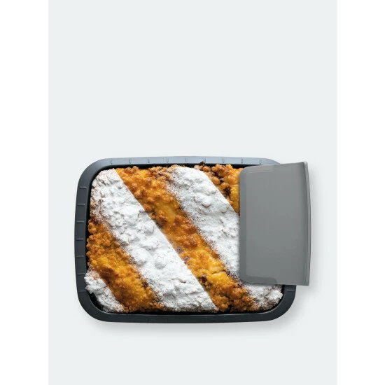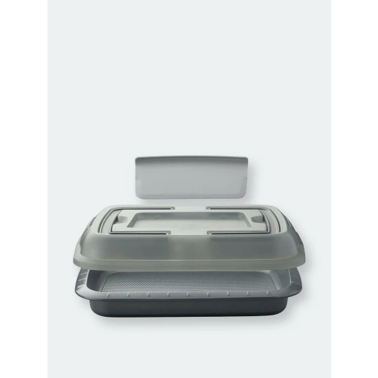 Covered Cake Pan with slicing is more than a quality baking pan; it’s also a convenient cutting system. The unique patented guideline grid around the outer edges of every pan allows you to simply line up the cutting tool, and press down to create any portion size desired. Every slice is beautifully uniform. The cutting tool with silicone handle is tough enough to cut the cake yet won’t damage your pan.