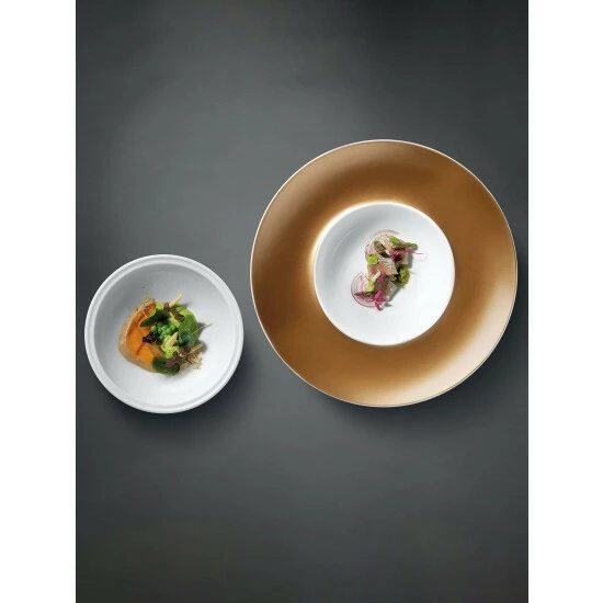You’ve created a real culinary masterpiece and you want to keep your table guests in suspense until the very last minute? Then this deep presentation plate with matching bowl is just the thing you need to create that perfect moment of surprise! Alternatively you can use the bowl as a separate item to serve a delicious side dish. The high-quality porcelain with classy golden rim will instantly add a touch of glamour to your table and is dishwasher safe so the clean-up is a breeze.