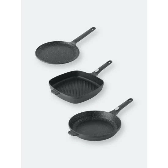 Add your favourite vegies, some chicken and a tasty sauce in this stir frying pan and you’ve got a delightful meal! Or whip up some American blueberry pancakes on your new pancake pan. The choice is yours. These aluminium pan distributes heat quickly and evenly while the flat bottom ensures that all your food is cooked equally. The non-stick coating means you need less to no oil, perfect for when you want to cook healthily. Set includes: 11″ Non-Stick Grill Pan, 11″ Non-Stick Fry Pan, and 10″ Non-Stick Pancake Pan