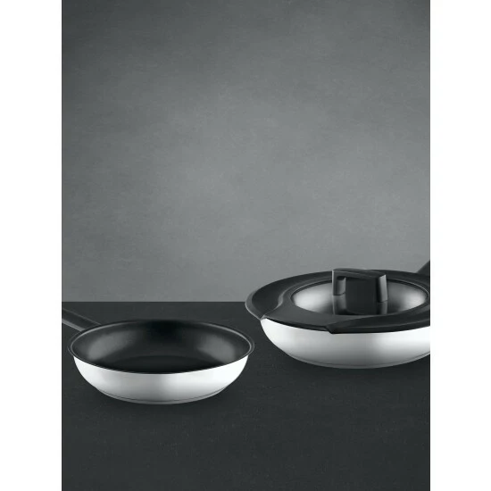 The gem downdraft cookware was specially designed to ensure a controlled steam release and directs the steam from inside the pot directly to the exhaust fan. This not only eliminates any lingering odors but also minimizes heat loss for energy-efficient cooking. Perfect fit for all cooktops, cooker hoods and downdraft exhaust systems. The universal lid can be used on both fry pan and has integrated air ducts in its silicone rim to stimulate the air flow. The lid can either be used to close off the pot in order to speed up the heating process, create a low pressure cooker and preserve the heat and flavors in the pot during cooking, or, when rotated 180 degrees, to let the air escape and guide the steam from inside the pot directly towards the downdraft vent. Constructed of surgical grade 18/10 stainless steel for long lasting use. Both fry pans have a high-quality non-stick coating for easy food release and clean-up. Both pans feature stay cool handles that have hanging loops for easy storage.