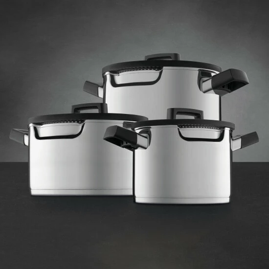 This cookware set has a lid allows for a controlled steam release from the body of the pan, letting you direct the steam to your downdraft exhaust system. You can rotate the lid to lock in steam and speed up the cooking process. Features stay cool handles for stay, comfortabe handling.