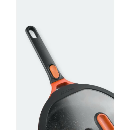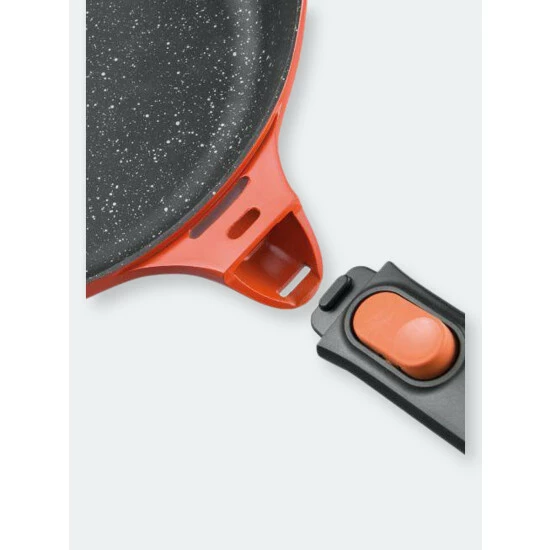 Versatile is the best word to describe this aluminum sauté pan with detachable handle. Whether you want to fry a couple of burgers, sauté vegetables or rustle up a risotto, with this pan it’s a piece of cake. Want to cook a larger piece of meat in the oven? Just snap off the detachable handle and slide the pan in the oven with the convenient helper handle! Like the other pots in this range, the sauté pan features a high-quality non-stick coating and pouring rims as well as a lid that has two pouring areas for precise straining and can be positioned vertically on the pan to avoid condensation drops on your stovetop.