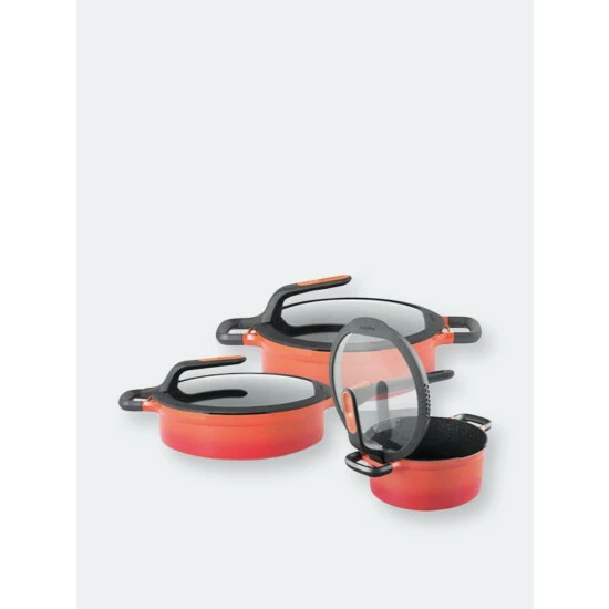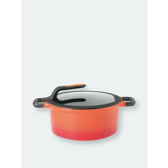 With a capacity of 7,3 liters, this aluminum stockpot is a great size to prepare a family meal. Whether you’re making soup, stew or stock, this brightly-colored pot with convenient pouring rims, a multilayered non-stick coating and comfortable stay-cool handles is always up for the job. An added bonus is the glass lid that has an ergonomic handle as well as two different sized pouring areas for precise straining of various ingredients and can be positioned vertically on the pot so that you won’t get any condensation drops on your stovetop and always have a free hand to stir and serve.