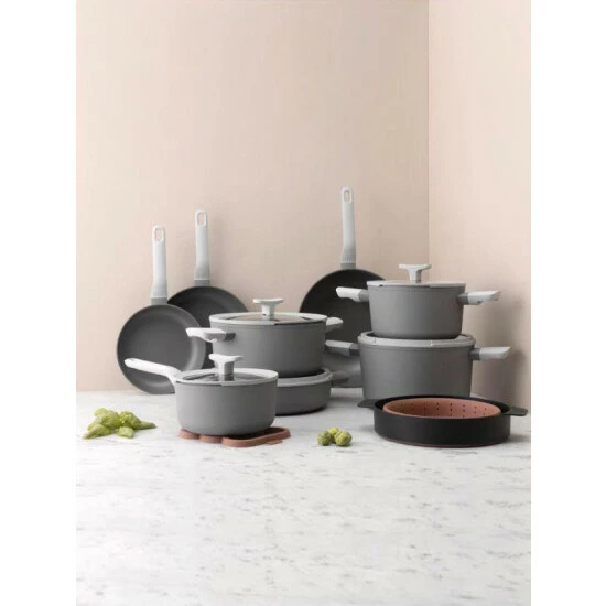 With its aluminum body that ensures a fast and even heat distribution and non-stick coating which allows you to cook with little to no oil, this covered sauté pan is sure to become one of your favorite cookware items in no time. It’s suitable for any kind of stovetop, including induction, and features a sturdy stay-cool handle that’s soft to the touch and provides a comfortable grip. So whether you’re in the mood for some risotto, paella or sautéed veggies, just place your ingredients in the pan and keep an eye on your food through the clear glass lid that helps you to cook energy-efficiently and features a drain hole for effortless straining. Leo Pots/saucepans : body : 3.5 / Induction Bottom : 3.8mm