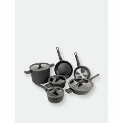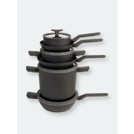 The leo 10pc cookware set, dark grey is everything you need in your kitchen plus a few additional bonuses. Whether your frying up some stir fry, or making a heart-healthy soup, this set is sure to get the job done. The fernogreen non-stick coating, the soft-touch handles and the glass integrated straining features on the lids make your life in the kitchen a breeze. The leo collection is as spontaneous as you and ready to allow your imagination to run wild in the kitchen with this sets versatility and function.