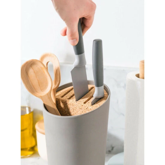 This set has been designed to be multifuctional, transforming your countertop from the moment you unpack the box. The spoon rest keeps your counters mess free, and was designed to hold more than spoons, lids and cutting board fit perfectly. Once your utensils are clean store them in the utensil crock. The crock was created with a removable cork insert that allows you to hold you knives and utensils in once space, perfect for small kitchens!