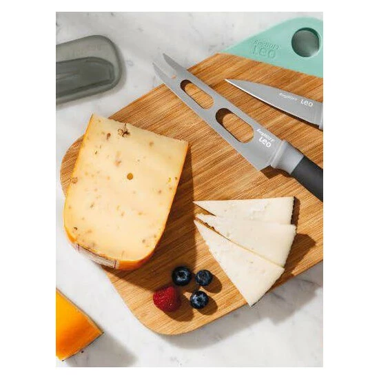 If you’re looking for an all-round cutting set, this small cutting board with stainless steel cheese knife and paring knife is the perfect solution. The bamboo cutting board is great for cutting a wide variety of ingredients but can also be used as a serving tray for cold meat and cheese. So when you’re having your next wine and cheese night, simply get out this set, enjoy the ease with which the cheese knife glides through the cheese thanks to the blade with non-stick coating and cut-out pattern and use the convenient fork-tipped spear for serving. Want to serve some sliced figs, grapes, apples or pears with your cheese? That’s a job for the user-friendly paring knife.