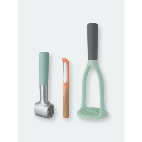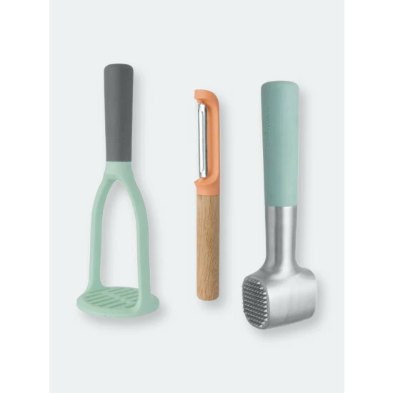 Set Includes: Potato Masher, Wooden Peeler and Meat Hammer. A must-have trio for your kitchen! Potatoes are no match for the stylish Leo potato masher. Perfect to prepare a delicious dish with potatoes or cauliflower. The potato masher is designed with a practical soft-touch handle. The peeler has an ergonomic handle that makes the task easy and efficient. The Y-peeler has an integrated potato eye remover. Designed in a light-hearted color with a beautiful wooden grip. The stylish meat hammer comes with two different sides: a rather smooth end for flattening meats and poultry, and the other end with “teeth” is used for tenderizing meats. Also great to crush garlic and nuts.