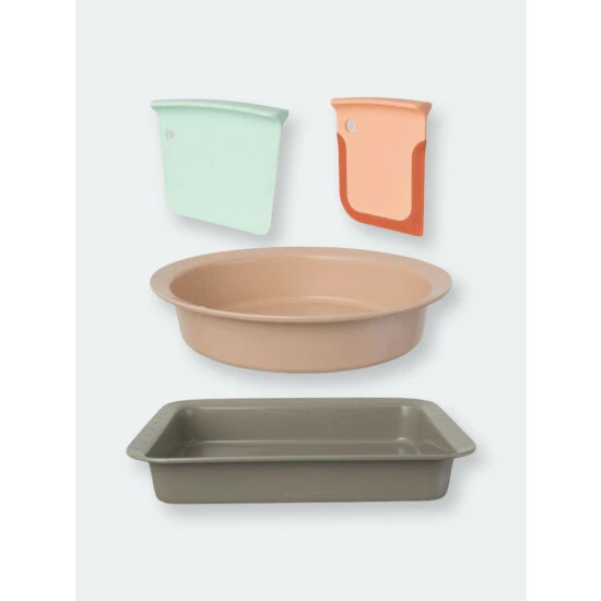 Get started on your baking career (or hobby) with our Leo 4pc Starter Bakeware Set. Each cake pan comes with non-stick properties for lack of mess, and also has grid line marks so you can practice portion control with your delicious creations. Use the slicer to cut out your dough,, and the scraper to get every inch of batter in that bowl.