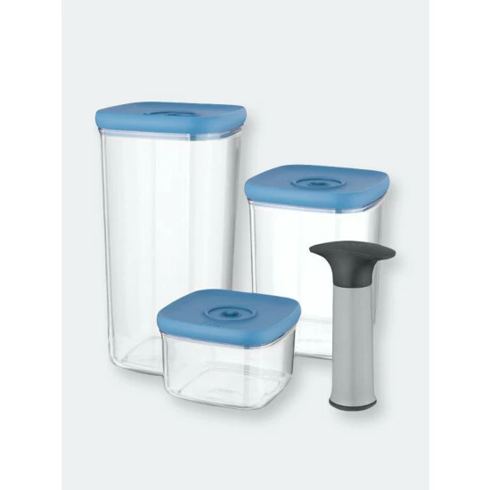 Homemade cookies, a crisp salad or ground coffee beans, with these practical and stackable food containers, you can easily keep it all fresh and tasty! Thanks to the user-friendly vacuum pump, your food is sealed airtight and leak-proof for maximum freshness and optimal preservation of flavors and aromas. This stackable food storage system is dishwasher safe and comes complete with the vacuum pump and 3 containers (4.5×4.5×3.25 0.63qt, 4.5×4.5×6.5 1.4qt, and 4.5×4.5×9.75 2.1qt).