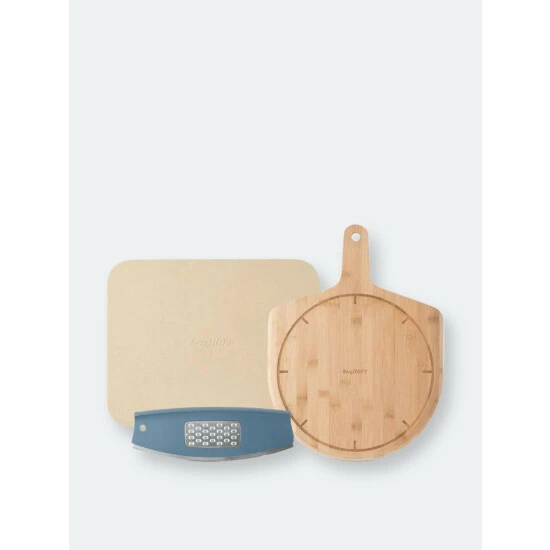 Create delicious and authentic Italian pizza at home with the Leo pizza set. The high-quality ceramic pizza stone holds and distributes heat evenly while absorbing moisture from the dough which results in crusty perfection. The slicer delivers two functions in one; the blade allows you to easily slice thin and thick crust pizzas while the integrated grater finely grates your cheese. The shovel from natural wood is designed to slide under the pizza to place it in a hot oven and take it out when ready. The shovel goes directly from the oven to the table as it doubles as a cutting and serving board. The integrated grid lines make portioning easy and ensures that all the delicious pieces are equally sized.