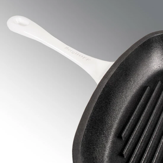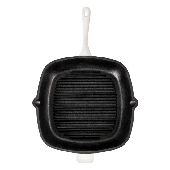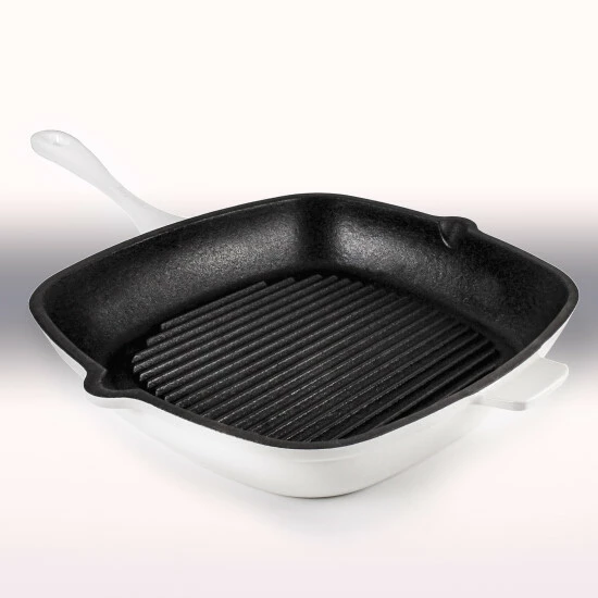 The 11″ white square grill pans body is made of enameled cast iron which will provide a steady and even heat distribution, the enameled coating allows for being stain resistant, dull resistant and will stand up to long lasting use. The cast iron construction provides strong heat retention and no additional seasoning required. Ideal for use on any cooktop, including induction; for the best results use a low to medium heat. The square grill pan is an excellent choice for grilling meats, seafood or vegetables and requires little oil and no seasoning. Oven safe up to 400 fahrenheit degree