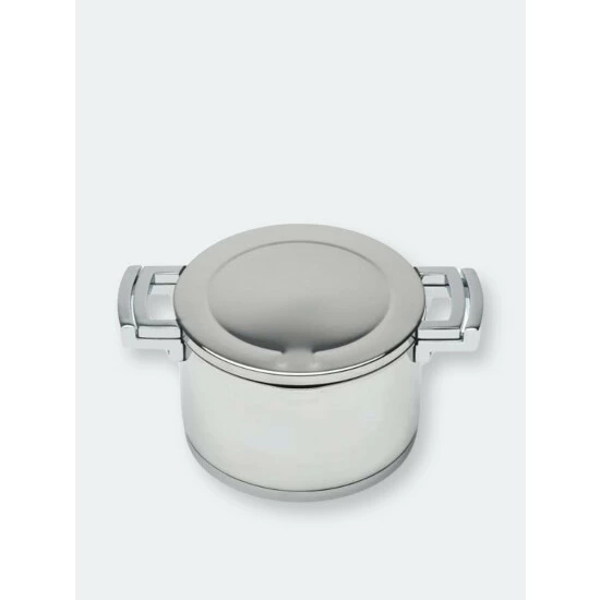 7″/2.6qt Covered Casserole is made with durable 18/10 stainless steel, 0.8 mm of wall thickness. The pot is provided with a practical spout to simplify pouring which is possible thanks to the special holes in the rim. Handles: zinc alloy, 3-layer capsule base, stainless steel cover. Cover also usable as a hotplate and suitable for all heat sources.