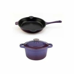 Set includes: 3 quart covered dutchoven, 10″ fry pan. Neo 10″ purple cast iron fry pan and the 3qt purple covered dutchoven both are kitchen staples that every ambitious home chef should have handy. Grill or stew your heart out with either one of the these they’re great for creating strong, even heat and they season as you use them. Cast iron has great heat retaining abilities and can be used on any heat source. Classic in a modern design, solid material for all your cooking needs! Oven safe up to 400°f.
