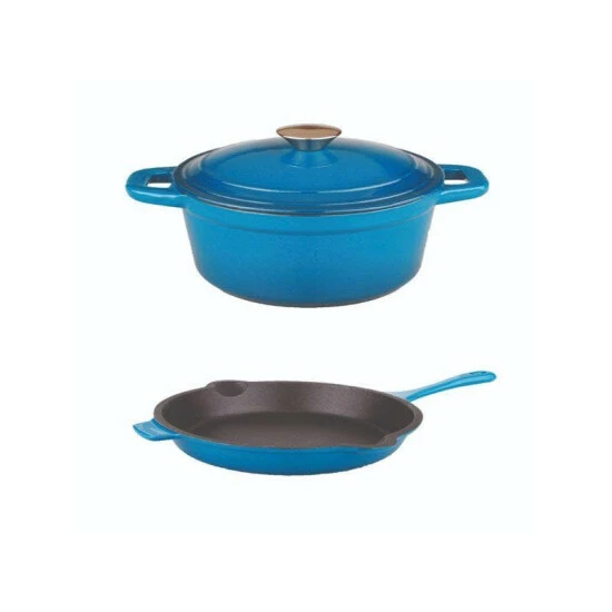 Set Includes: Blue 3qt Cast Iron Covered Stockpot, 10″ Cast Iron Fry Pan. Cast iron has great heat retaining abilities and can be used on any heat source. Classic in a modern design, solid material for all your cooking needs! Oven safe up to 400°F.