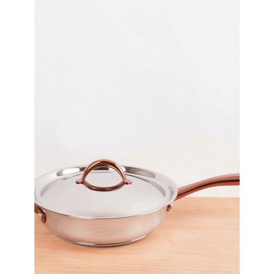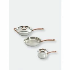 Berghoff’s ouro gold cookware, timeless beauty that will last for years. Crafted from tri-ply hygienic 18/10 stainless steel with a mirrored finish, this cookware comes with beautiful rose gold accents on the handles giving this set a unique and attractive look. Professional quality cooking with effortless cleanup. The ouro gold 4pc starter set with metal lids can be used for a variety of meals. Set includes 1x 10″ fry pan, 1x 6.25″ covered sauce pan, and 1x 10″ covered deep skillet. The fry pan crisps up bacon and sears steaks to perfection. Braise carrots, or make your favorite rissoto with ease thanks to the high sides of the covered deep skillet. Use the sauce pan to make your favorite homemade gravy, mashed potatoes, small batches of pasta, and more. The stainless steel lid allow you to cook more efficiently securing heat inside the pot. Our durable stainless steel cookware, designed with versatility and functionality in mind, is built to withstand a lifetime of heavy use in the home. Ergonomic, double-riveted stainless steel rose gold handles with copper inlay provide a secure grip. High quality elements were put into every aspect of this cookware. The solid base allows you to use on all cooktops including ceramic, gas, induction, electric, and glass. Please allow cookware to cool completely before attempting to clean. Dishwasher safe.