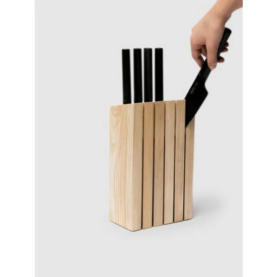 Want to give a stylish touch to your countertop? This ash wood knife block looks great in any kitchen and safely stores up to five knives. The angled design helps to protect the blades while the large, well-distanced slots ensure easy removal of each knife. The knife block comes with an anti-skid base for extra stability.