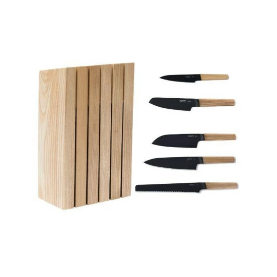 The ron 6pc starter knife block set offers a range of versatile knives for the most common jobs in the kitchen. These black knives featuring a titanium and non-stick coating also contain contrasting ash wood handles for a sophisticated look. Well balanced with a heavy bolster providing perfect balance for increased control. Comes with a wooden knife block to organize everything.
