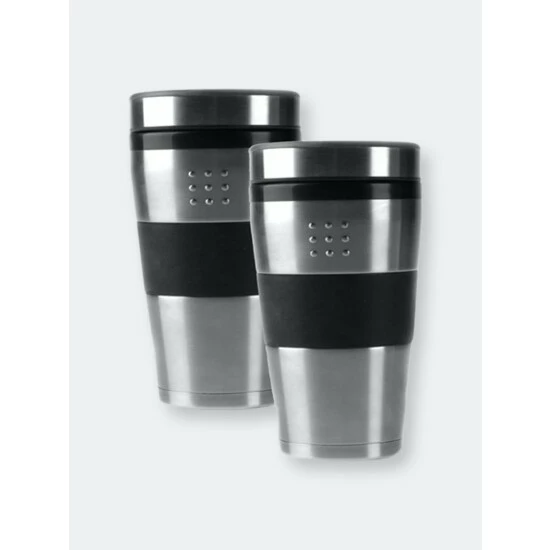 Stainless steel w/ black accent (7″) travel mug. The inside is made of PP (polypropylene)-double walled and a rubber underside serving as a anti-skid layer. Fits about every car cup holder.