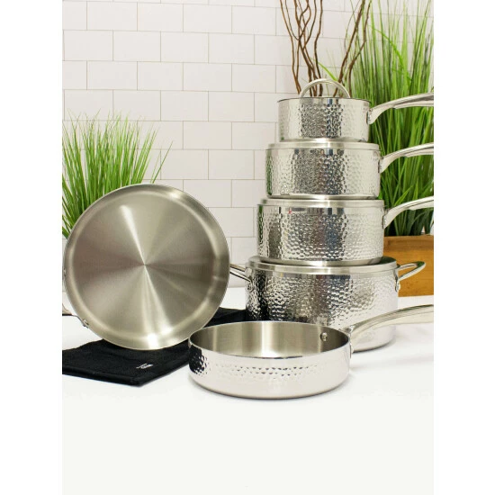 This beautiful hammered stainless steel cookware set is sure to be the focal point of your kitchen. With its stunning hammered design you will be glad to show this set off to all your friends and family.