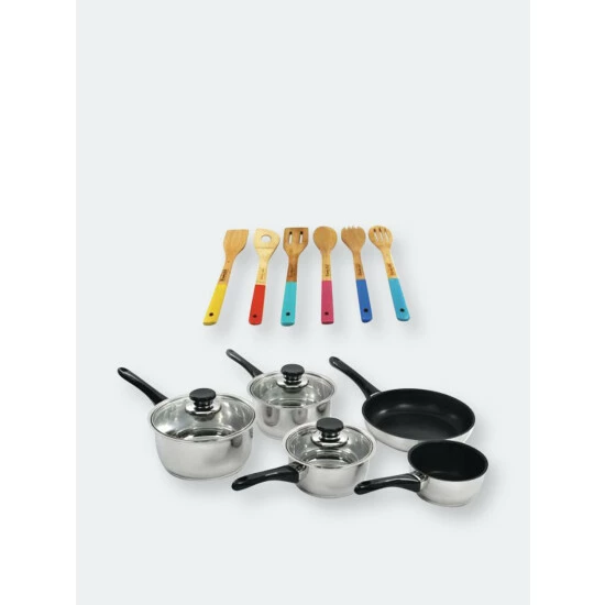 Set Includes: 6.25″ covered sauce pan, 7″ covered sauce pan, 8″ covered sauce pan, 5.5″ milk warmer, and 10″ fry pan. 6 Pieces Bamboo utensils Multi colored. Glass lids for easy monitoring without the need to lift the lid, which helps to save energy and keep valuable nutrients inside the pan. Revolutionary multi-layer base for fast and energy-saving cooking. Even heat distribution throughout complete surface of the base. No hotspots or burning food. Fry pan and milk boiler have a multi-layer PFOA-free non-stick coating for easy food release and healthy cooking (use as little oil as you’d like). Large stay-cool handles for easy grip and control. The utensils set is made of bamboo which is seeing a resurgence in popularity as it is considered a “œgreen product.” Cleaning bamboo is easy, just wash with soap and water. The natural beauty and durability is unique. Set includes two bamboo spatulas and four oversized spoons with multicolored handles. Dishwasher safe.