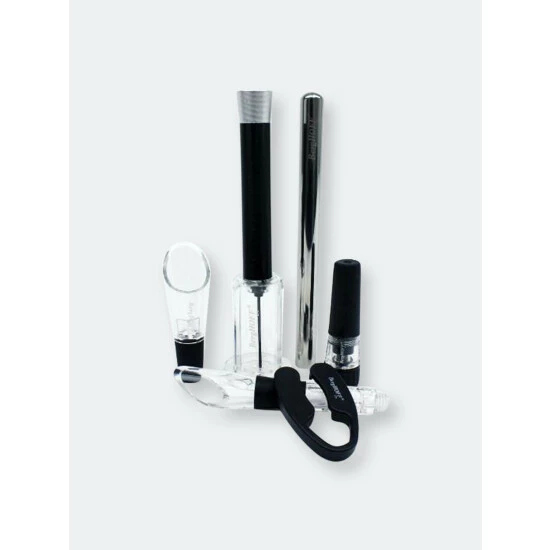 Taste the difference with this unique wine opener set by BergHOFF. This essential box set designed for wine enthusiasts features a foolproof air pump opener, foil cutter, stopper, aerator pourer, and chiller pourer. This set is your one-stop-shop for all of your wine needs.